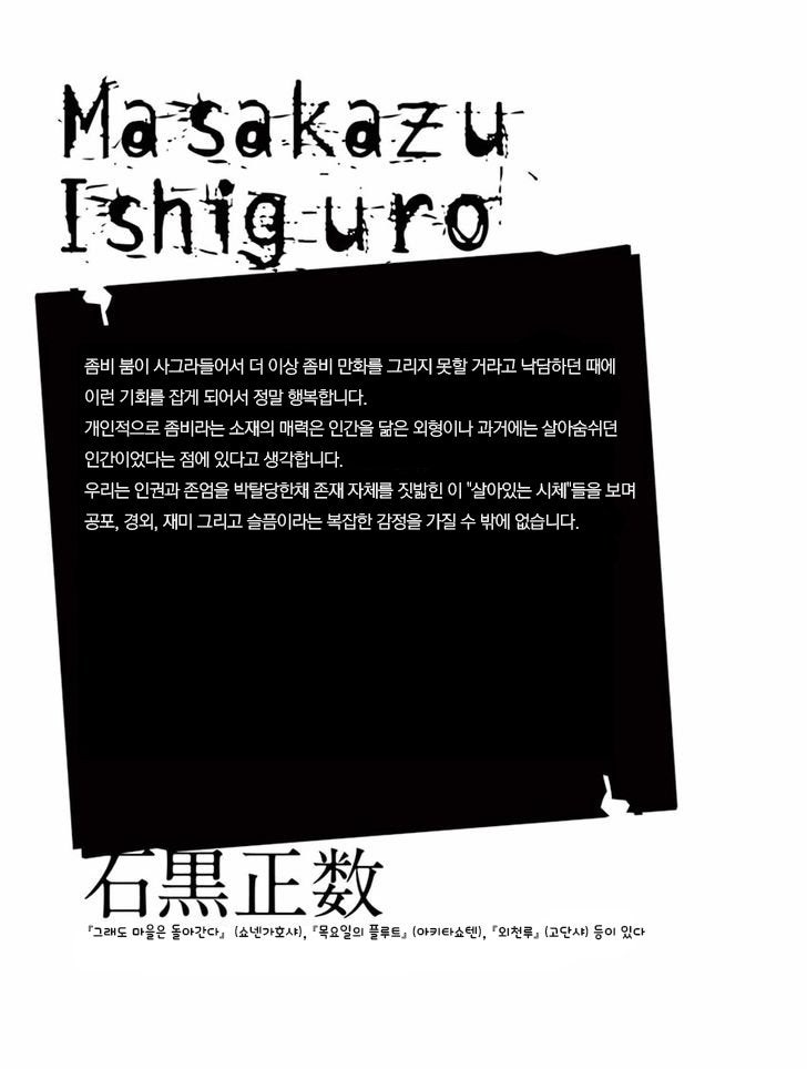 이시구로 마사카즈(石黒正数)의 『좀비가 있는 곳(ゾンビのいるところ)』은 『아이엠어히어로 공식 앤솔로지 : 8 TALES OF THE ZQN』에 수록된 8편 중 하나다옹. 이시구로 마사카즈는 『그래도 마을은 돌아간다』 등으로 유명한 일본 만화가로, 이 작품에서는 자신만의 독특한 시각으로 좀비 장르를 다뤘다옹. 작품은 좀비 아포칼립스 상황에서의 인간 관계와 생존을 주제로 하고 있으며, 작가 특유의 서정적이면서도 어두운 분위기가 특징이다옹~