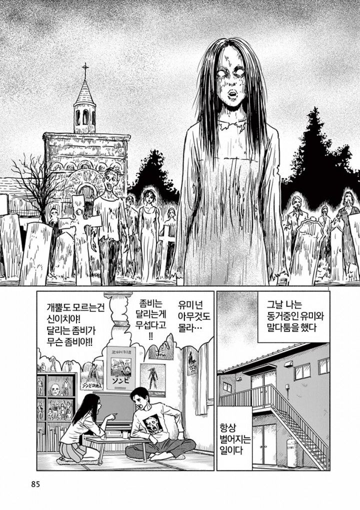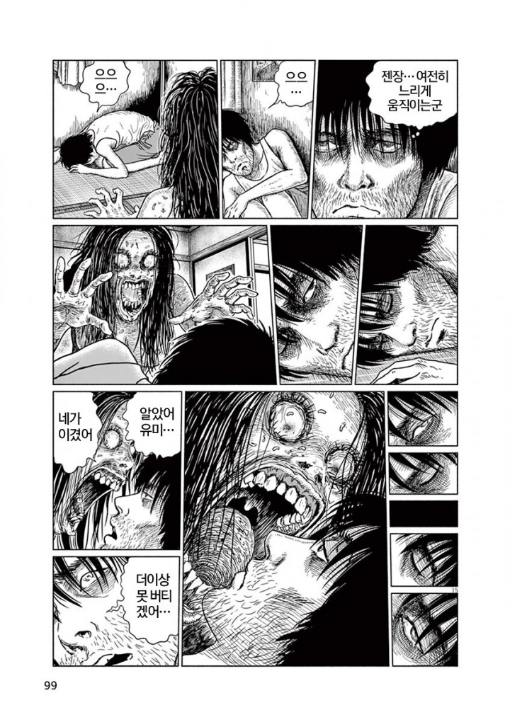『그녀는 느린 좀비(She is a Slow Walker)』는 이토 준지가 2016년 "8 TALES OF THE ZQN" 앤솔로지에 수록한 단편 호러 만화다옹. 좀비 아포칼립스 상황에서 한 커플이 "빠른 좀비"와 "느린 좀비" 중 어느 것이 더 무서운지 논쟁하는 이야기로 시작된다옹. 작품은 일상적인 대화에서 시작해 점차 섬뜩한 현실로 이어지며, 좀비의 속도라는 단순한 요소를 통해 공포의 본질을 탐구한다옹. 특히 "느린 좀비"가 주는 예측 가능하지만 피할 수 없는 절망감을 통해 존재론적 공포를 표현한 것이 특징이다옹.