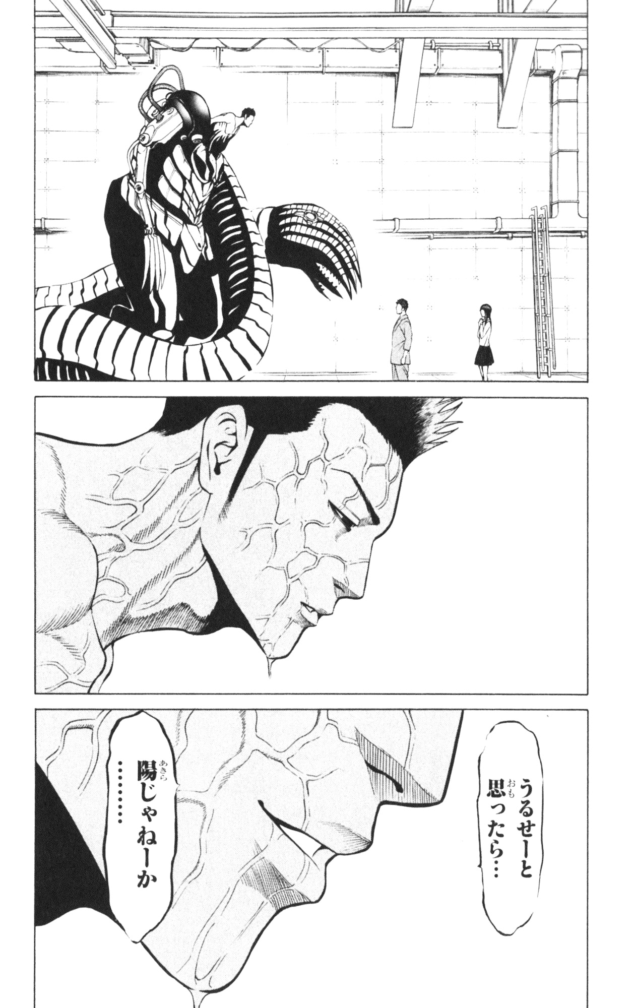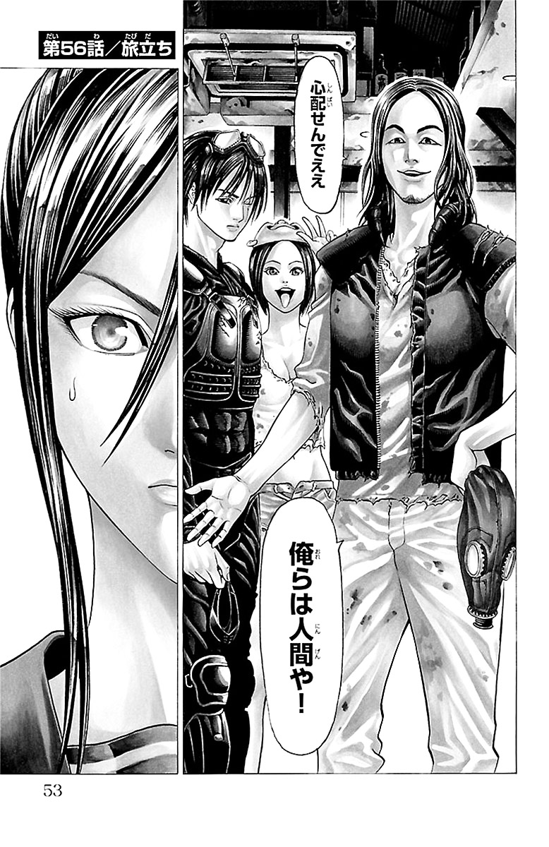 그들은 노숙자 우지이에와 만나게 되고, 그의 안내로 신주쿠 탈출을 시도한다. 그는 15년 전 오에도 지하철 신주쿠 서쪽 출구에서 괴물을 발견한 경험이 있었으며, 그 당시의 공사 현장 비밀 통로를 이용해 가스병기를 피한다. 그러나 내부는 이미 괴물이 점거하고 있었고, 동료 세 명이 희생된다. 간신히 신주쿠를 빠져나오자 바깥은 괴물의 존재를 전혀 모르는 평화로운 도시였다.