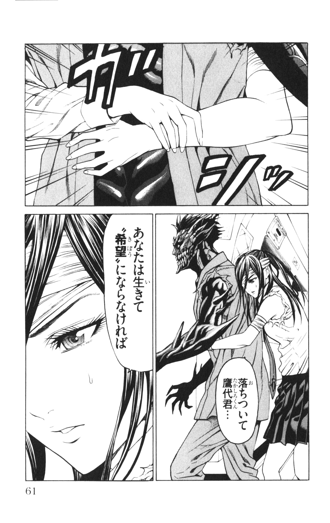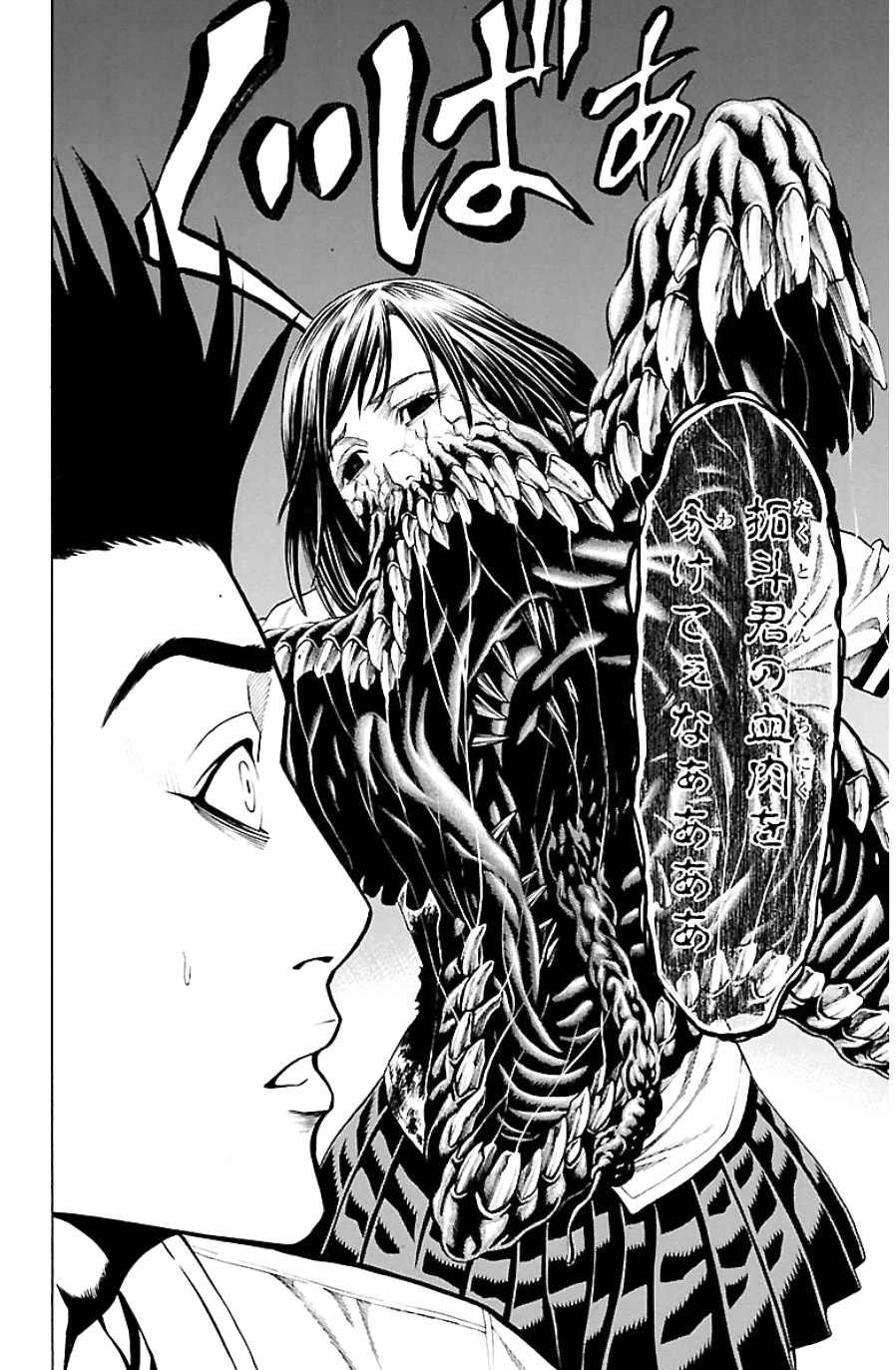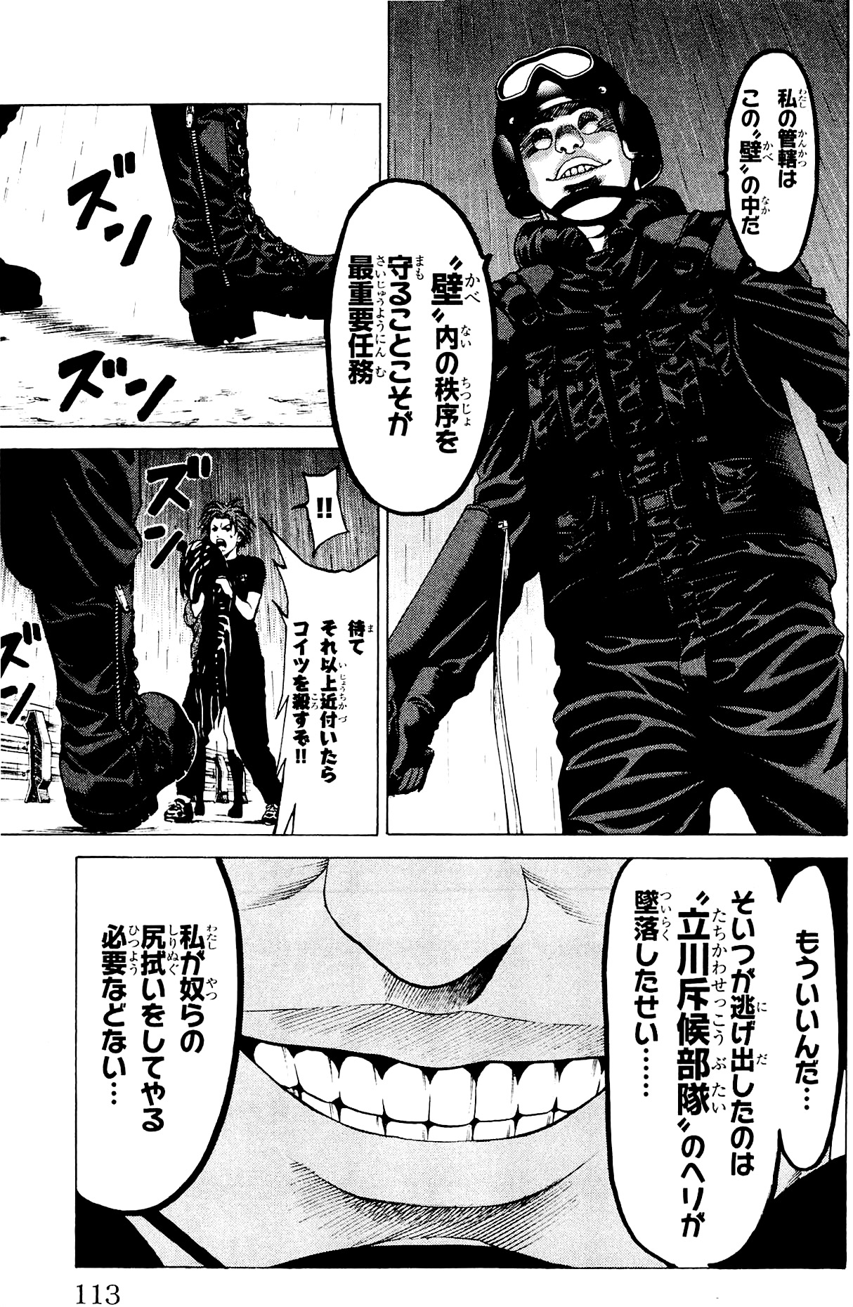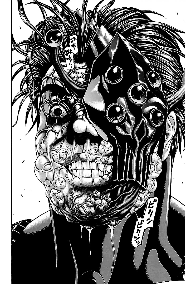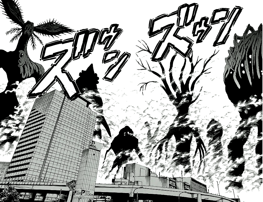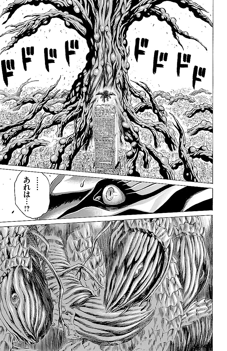 그러나 비행 도중 헬기 안에서 괴물의 유체가 각성하여 부대장을 단숨에 살해한다. 이어서 치명상을 입은 다케시게는 시라사키를 지키기 위해 괴물과 함께 헬기에서 몸을 던진다. 그리고 헬기가 타치카와의 거대한 골을 넘으려는 순간, 초거대 괴물의 촉수가 날아와 헬기를 격추시킨다.