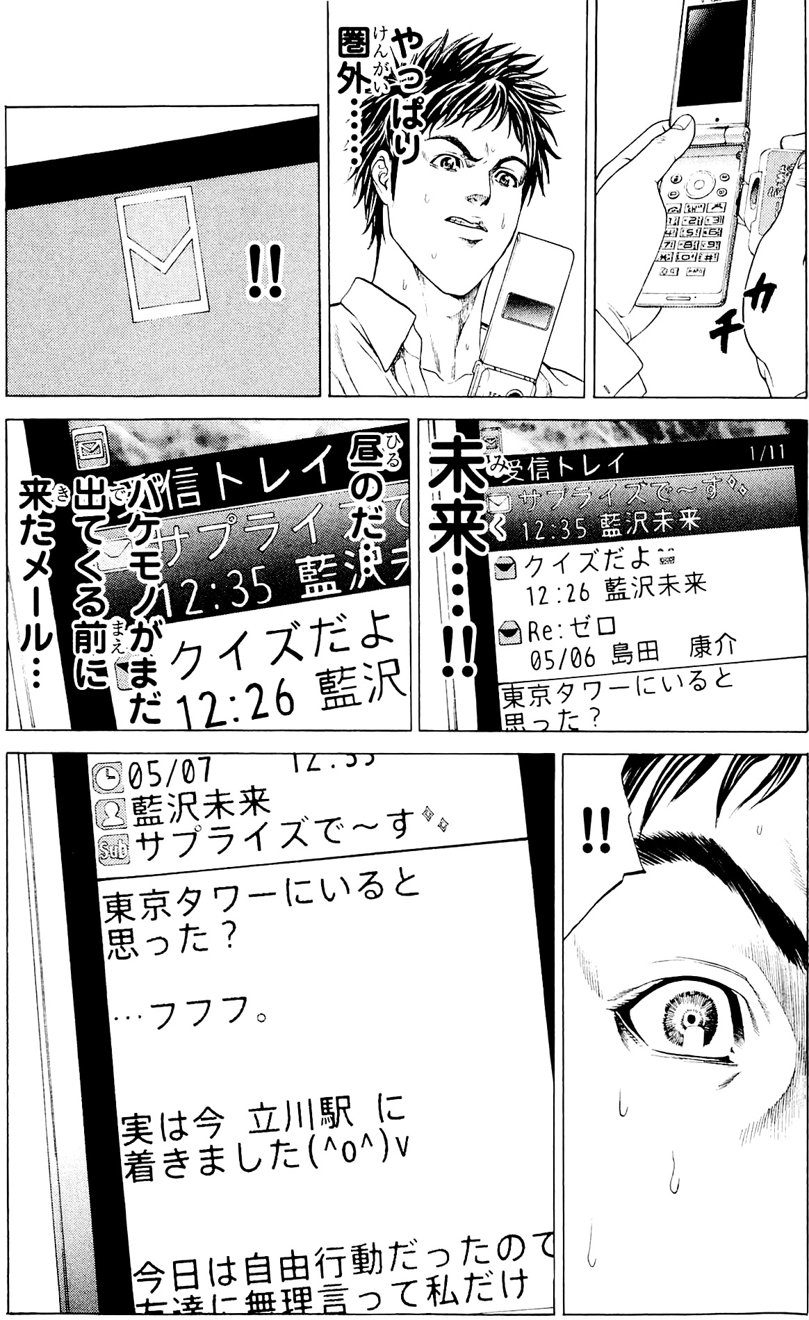 직후 교사는 거대한 괴물에게 짓밟혀 버린다. 그들은 주택가로 도망치다가 불량배 타도코로와 만나게 된다. 그러면서 마을에 뚫린 거대한 구멍, 민가에서 흘러나오는 뉴스에서는 타치카와의 이상 사태가 전혀 보도되지 않고 있다는 사실, 그리고 소꿉친구 미쿠루가 타치카와에 와 있다는 메일을 확인하게 된다.