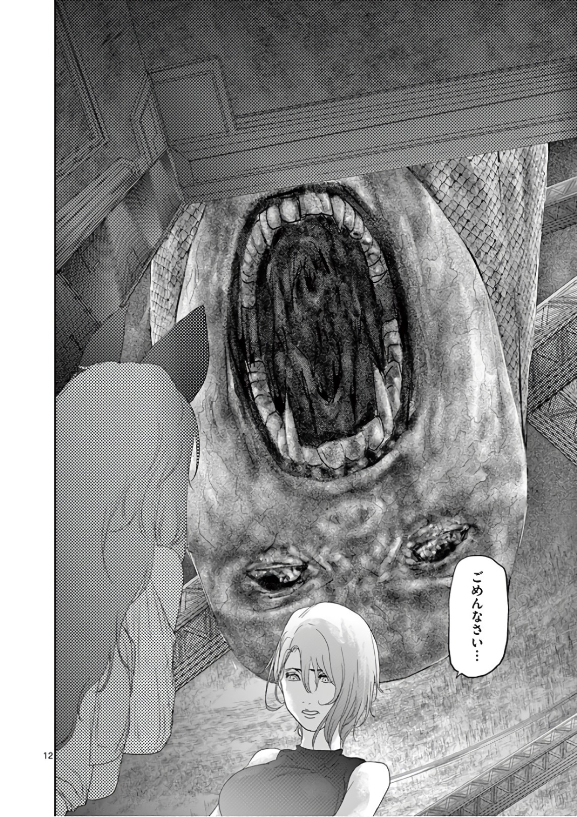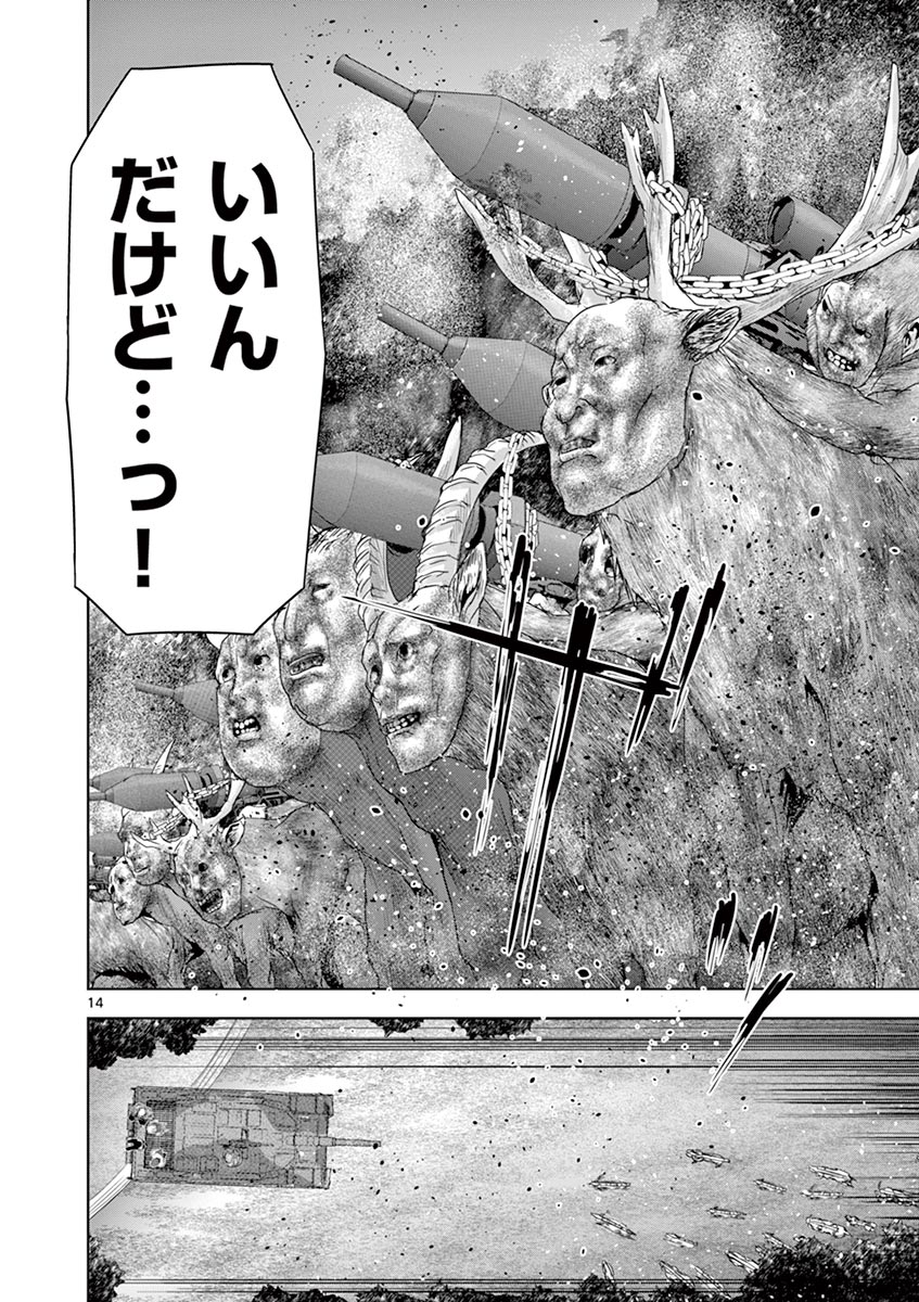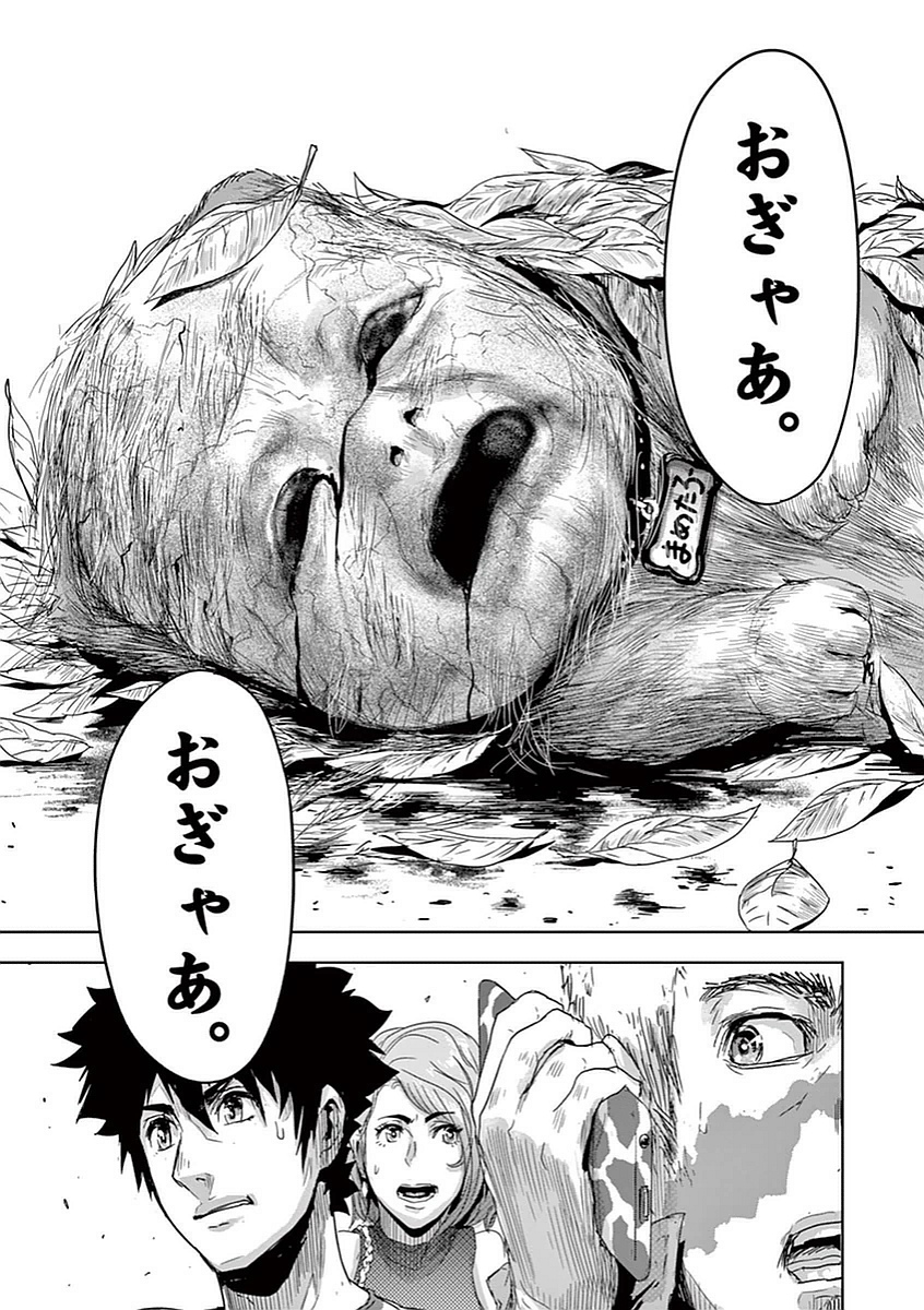 공포에 몸이 굳어버린 채, 마사토와 히토미는 황급히 리어카에 나카타 씨를 태우고 도망쳤다. 그러나 하나요뿐만 아니라, 동물원 안의 모든 동물들이 진멘으로 변해 두 사람을 공격하기 시작했다. 마사토 일행이 향했던 출구는 셔터로 닫혀 있었기에, 그 근처에 있던 코끼리 조형물을 눈여겨보고 그것을 활주로 삼아 리어카째 뛰어넘어 탈출하려 시도했다. 하지만 바로 뒤에서는 진멘들이 잡아먹으려는 듯 입가에 미소를 띠며 추격해오고 있었다. 간신히 사파리 월드에서 빠져나온 마사토와 히토미는 안도의 숨을 내쉬었으나, 닫힌 셔터 너머에서 그들을 바라보던 진멘들이 작은 목소리로 “시작된다”라고 중얼거리고 있었다.