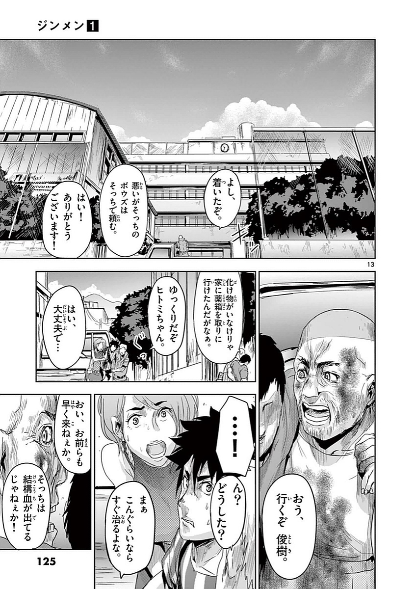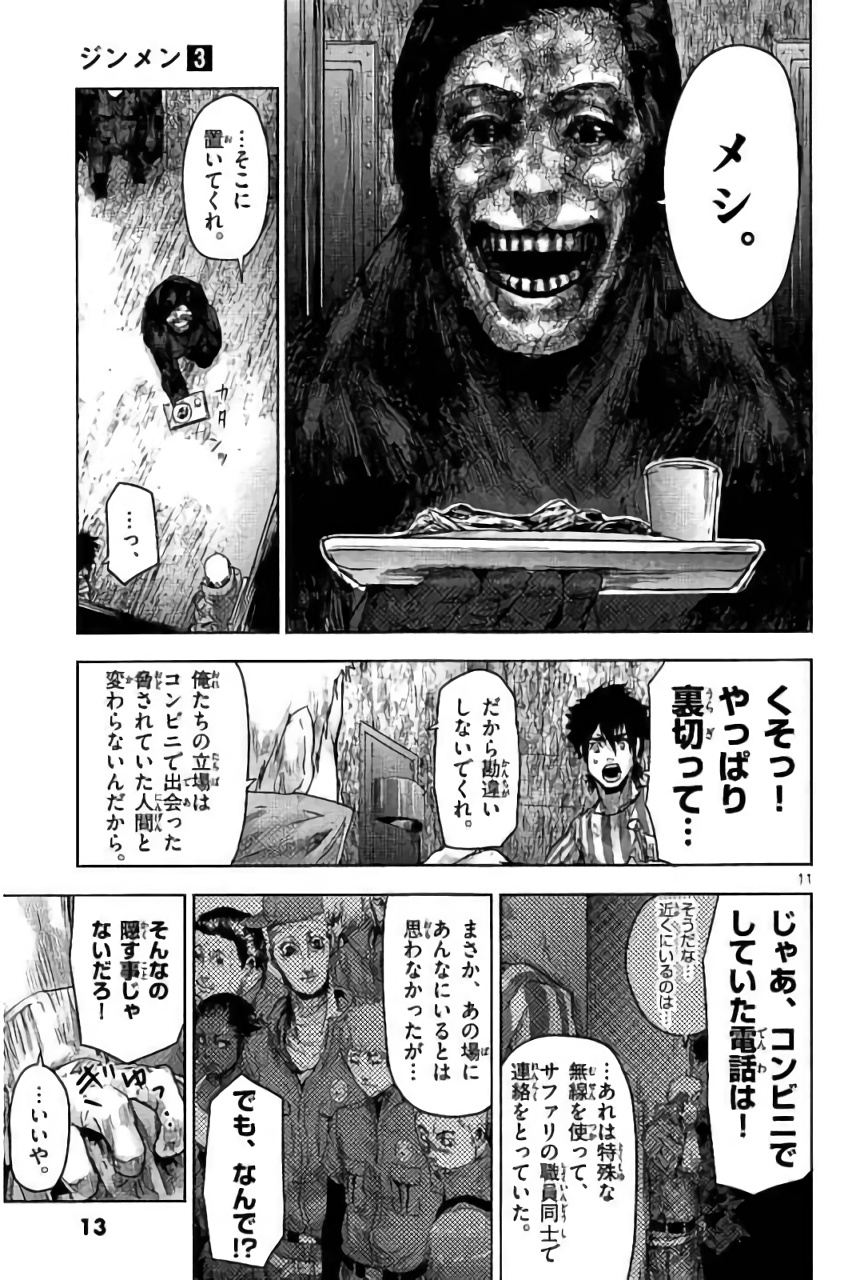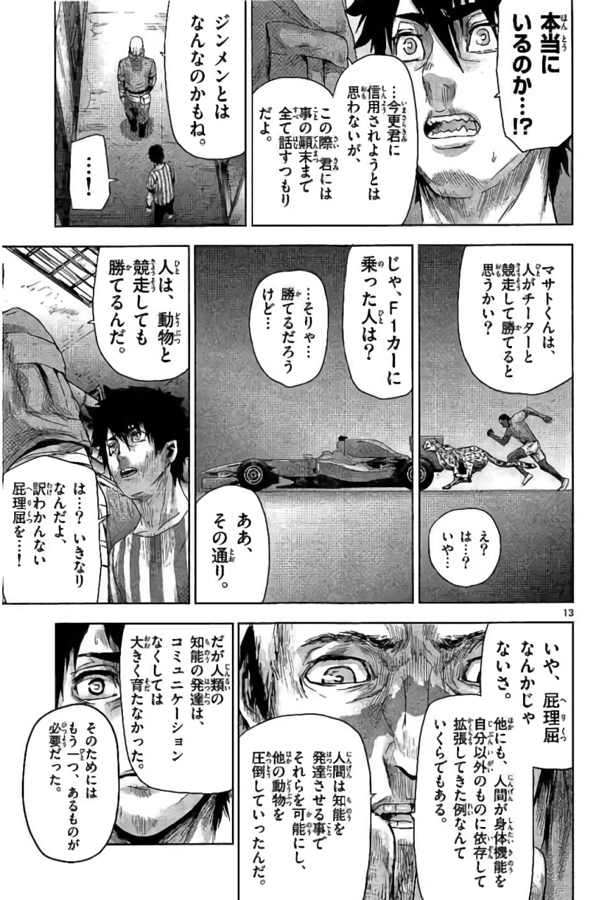 그 길에서 히토미는 지금까지 보여준 마사토의 비정상적인 괴력, 후각, 회복력 등을 직접 목격하고, 이것이 과연 인간이 낼 수 있는 힘인지 의문을 품기 시작했다. 주둔지에 도착한 마사토 일행은 그곳에서 진멘에게 붙잡혀 지하 셸터에 감금된다. 마사토는 나카타 씨와 같은 방이 되었고, 나카타 씨는 “좋은 기회다”라며 진멘에 대해 알고 있는 사실을 이야기하기 시작했다. 그것은 진멘이 탄생하게 된 계기였다.