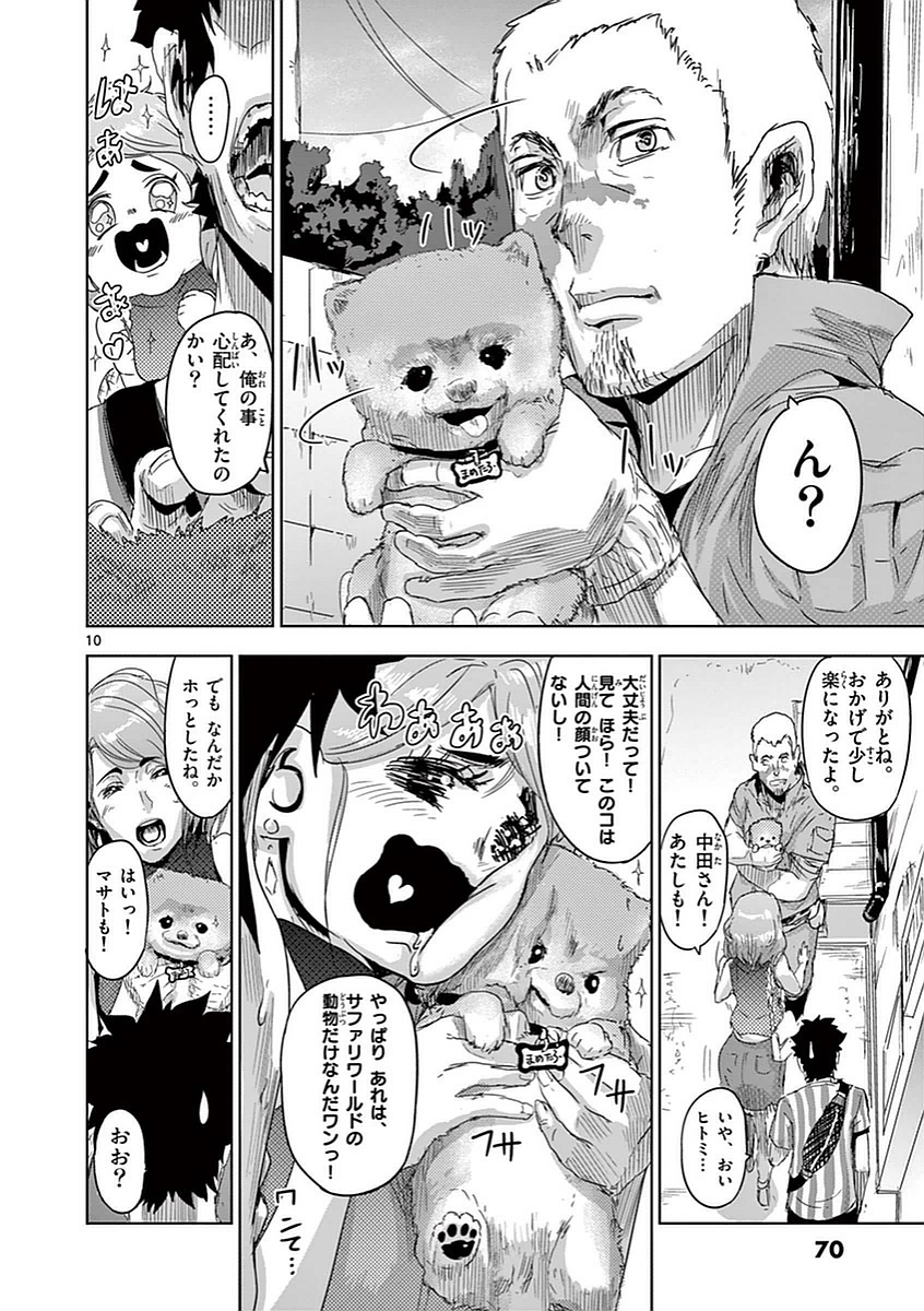 겨우 사파리 월드에서 탈출하는 데 성공한 마사토 일행이었지만, 바깥 풍경을 본 순간 절망에 빠졌다. 놀랍게도 사파리 월드에서 탈출한 진멘들이 마을 사람들을 습격하고 있었고, 주변 일대가 피로 물들어 있었던 것이다. 마치 패닉 호러 영화와도 같은 광경에 마사토와 히토미는 충격을 감추지 못했다. 그리고 마침내 기절해 있던 나카타 씨가 의식을 되찾았다. 마사토는 혼란스러운 표정으로 나카타 씨에게, 사파리 월드의 동물들에게 도대체 무슨 일이 일어났는지, 그리고 왜 하나요가 나카타 씨와 닮은 얼굴로 변해 있었는지를 따져 물었다. 그러자 나카타 씨는 “고리 원장이 부임하고 나서 얼마 지나지 않아, 동물과 직원들을 대상으로 한 월 1회의 ‘친구 건강검진’이 의무화되었다. 손님 수는 늘어갔지만, 사파리 월드의 분위기는 예전과는 달리 변해버리고 말았다.” 라고 말한다.