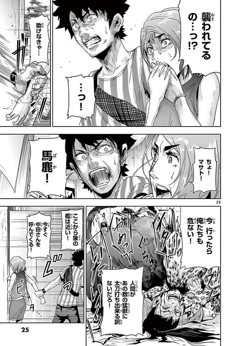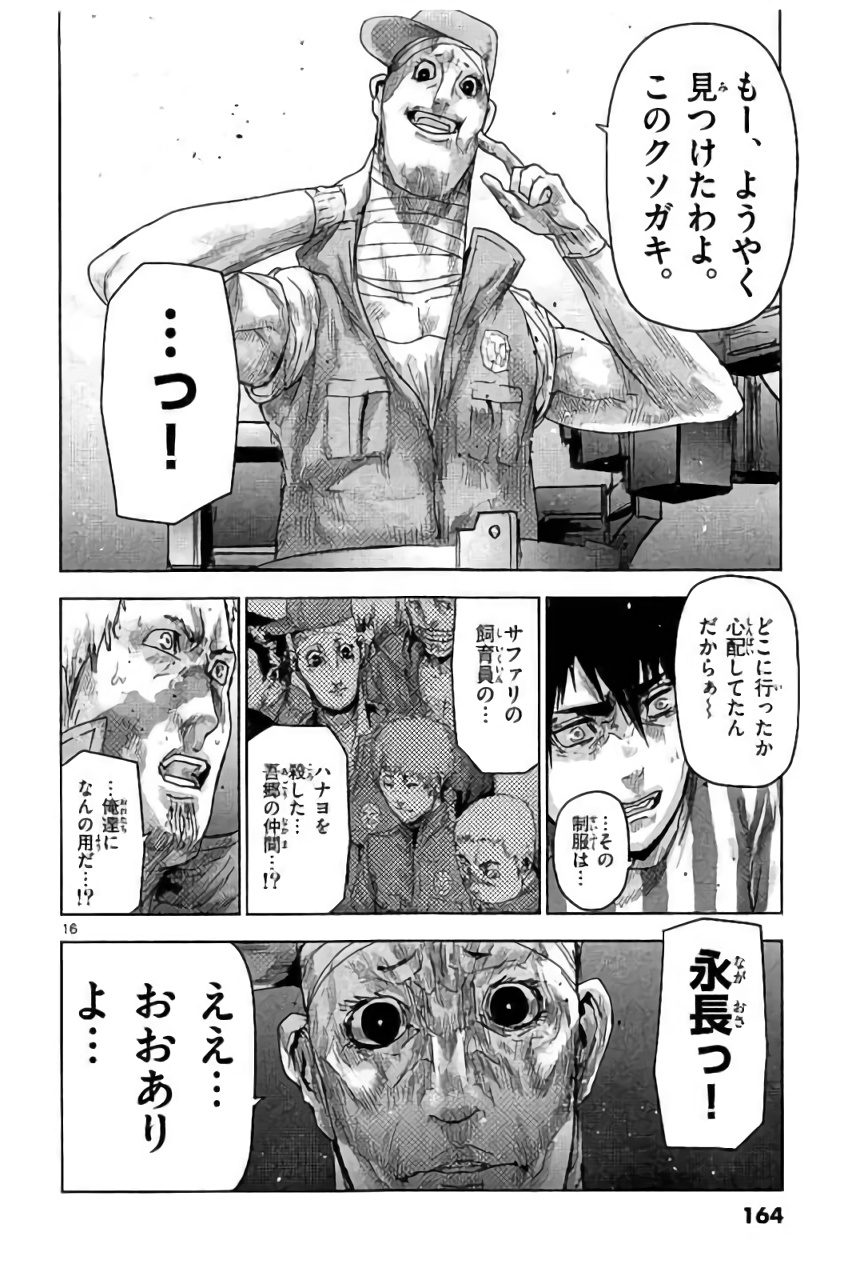 그러나 그 사육사는 도망치는 도중 맹수들에게 덮쳐져 먹잇감이 되고 말았다. 어떻게든 구하려던 히토미가 달려가려 했지만, 마사토는 두 사람만으로는 맹수들을 상대할 수 없다고 제지했다. 들키기 전에 빨리 하나요의 우리로 가서 나카타 씨를 부르자고 결심한 마사토는 히토미를 데리고 서둘러 그곳을 빠져나왔다.