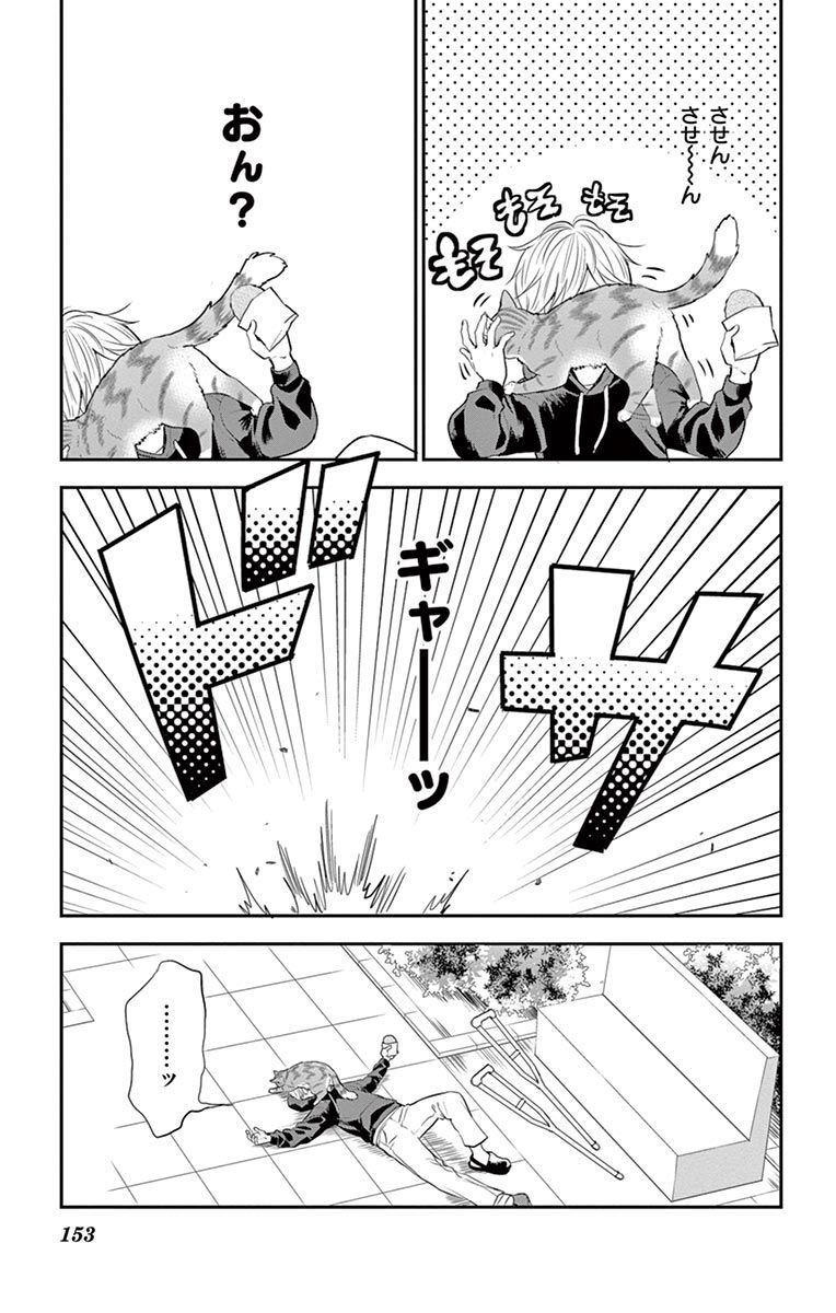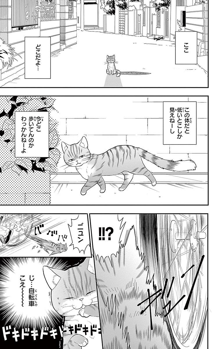 이 상황을 완전히 꿈이라고 믿어버린 나오는 높은 곳에서 뛰어내려 보거나 좁은 틈을 통과해 보는 등, 고양이가 된 것을 실컷 만끽한다. 들뜬 마음에 길고양이들에게 말을 걸었다가, 되레 고양이들에게 몰매를 맞고 만다. 몸의 통증과 허기 때문에 쓰러진 나오에게 한 여자아이가 발이 걸려 넘어지고 말았다. 아이가 들고 있던 주먹밥을 훔쳐낸 나오였지만, 고양이인 탓에 포장을 제대로 뜯지 못한다.