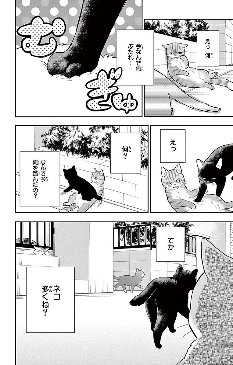 인간이었을 때는 아무렇지 않게 넘기던 일이, 고양이나 개에게는 큰 위험이라는 사실을 알게 된 나오는, 더 무서운 현실을 깨닫는다. 바로 ‘고양이 세계’였다. 거리를 걷는 나오에게는 길고양이들의 습격이 종종 있었다. 그냥 곁을 스쳐 지나가기만 해도, 눈이 마주치는 순간 싸움 모드로 돌입한다. 번번이 만신창이가 되는 나오는, 고양이 세계에는 세력권(테리토리) 같은 것이 있다는 걸 알든 모르든, 몸으로 ‘고양이 세계는 위험하다’는 사실을 절감한다.