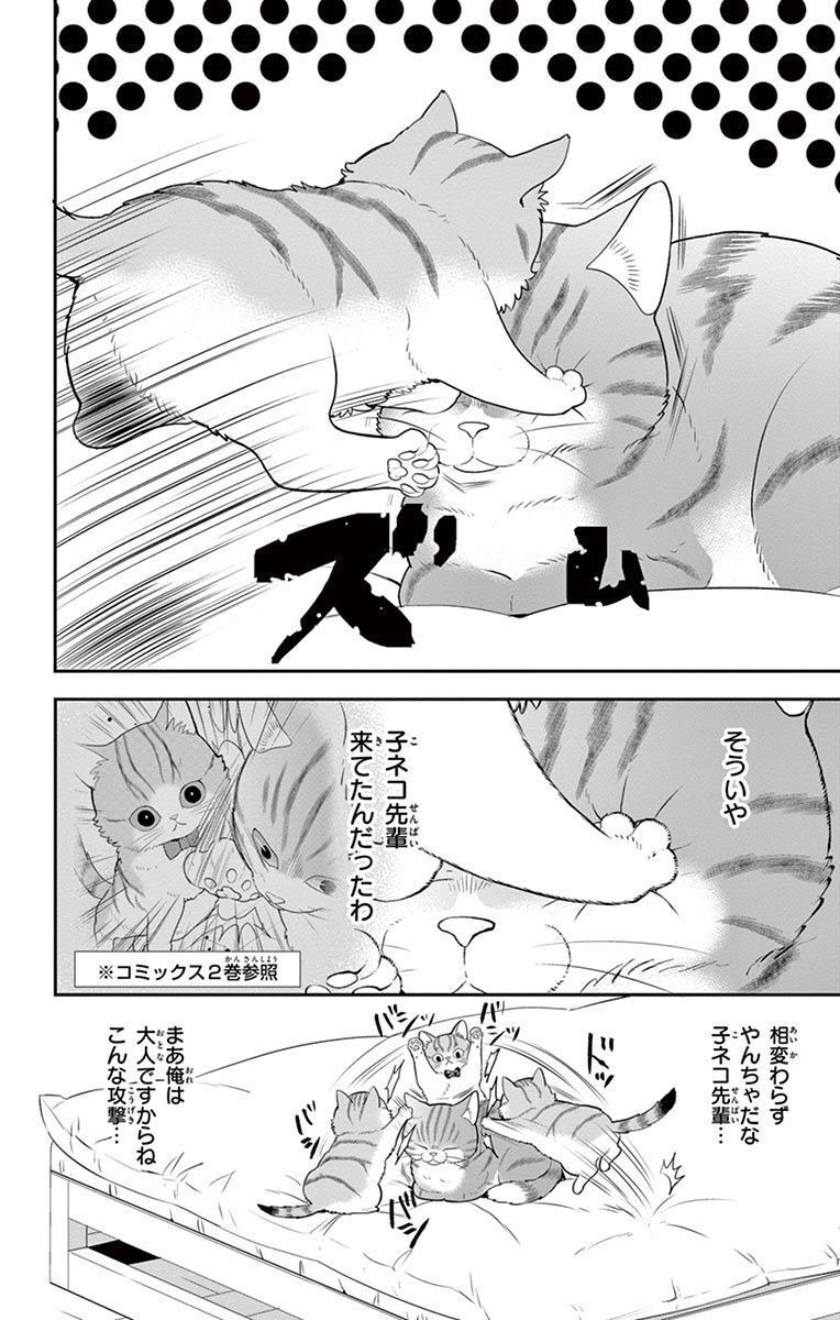 그러는 사이 나오의 입에서는 언젠가부터 주변 고양이들을 ‘네코 선배’라 부르며 예의를 갖추게 된다. 고양이 세계의 엄혹함을 직접 체감한 나오에게 어느 날, 치카가 아는 사람에게서 맡아 온 ‘마카롱’이라는 아기 고양이와 함께 지내는 시간이 찾아온다. 마카롱은 장난기가 한창이라 틈만 나면 나오를 공격하고는 잽싸게 달아난다. 새끼 고양이의 넘치는 기세에 압도되면서도, 고양이 선배로서 마카롱을 ‘꼬마 네코 선배’라며 존중하기로 한 나오는, 마카롱이 벌이는 장난을 묵묵히 견딘다.