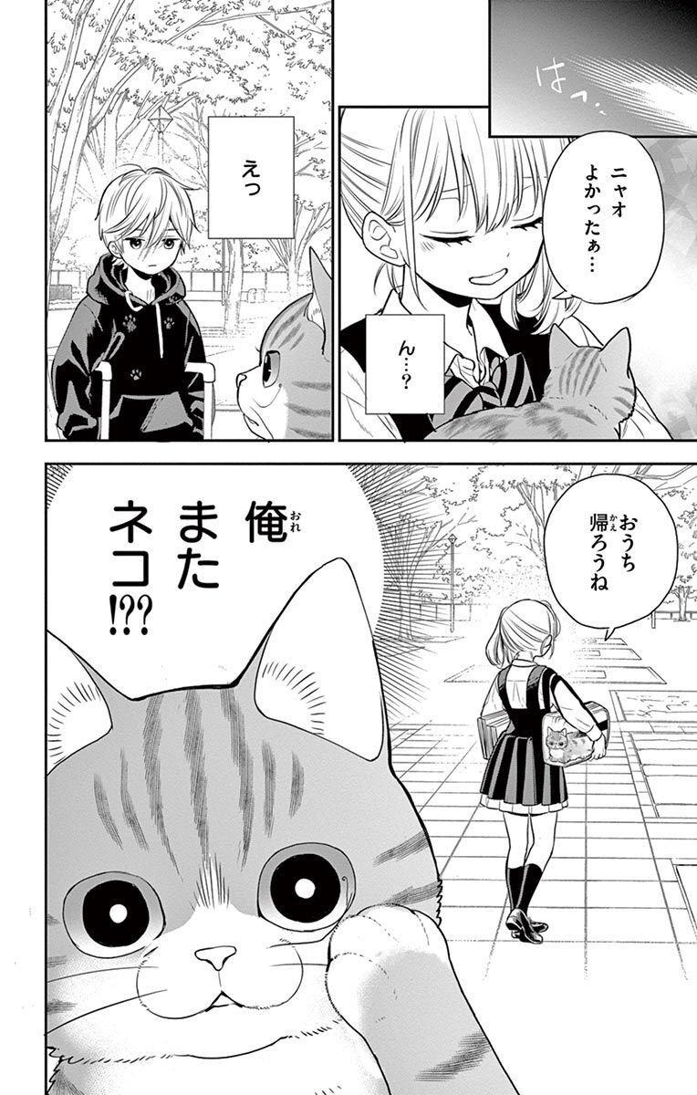 치카의 학생증을 돌려준 나오였지만, 어째서인지 그 자리에서 치카와 치카의 친구에게 스토커 취급을 당한다. 배고픈 자신에게 주먹밥을 나눠 준 다정한 치카마저 의심스러운 눈길을 보내는 데 충격을 받던 바로 그때, 치카가 뜻밖의 행동을 한다. 치카는 눈앞의 나오를 번쩍 안아 들고 “나 이 아이 키울래!”라고 선언한다. 이 순간부터 나오의 치카의 반려묘로서의 생활이 시작된다.