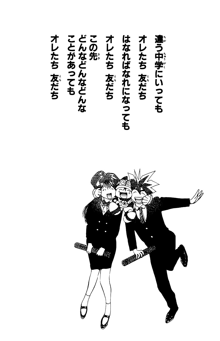 아프리카로 떠나는 자켄쟈 남매를 배웅하기 위해 이요나, 츠토무, 코레키요 등 사립학교로 진학한 친구들과 루이, 쟈바오 등 오랜만에 모든 친구들이 신도쿄 국제공항에 모인다. 모두가 서로 작별 인사를 하는 자리에서 네이요는 왜 타루루토를 부르지 않는지 혼마루에게 묻는다. 혼마루는 모든 친구들이 루트를 잊지 않았다는 사실을 깨닿는다.