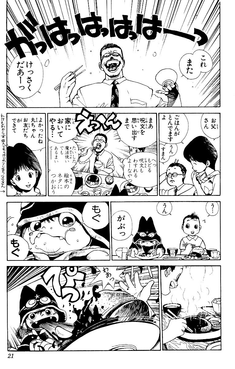 의기소침하여 집에 돌아온 혼마루는 나쁜일 후에는 항상 좋은 일이 생긴다는 엄마 치즈루의 응원을 받고 저녁은 혼마루가 좋아하는 특제 햄버거라는 말에 그림책 작가인 아빠 쇼군노스케를 깨우다 우연히 '정말 곤란해 음냐~(ほんとにこまったンガー)' 소환 주문을 외우게 되고 대마법백과의 마법진을 통해 견습 마법사 타루루토를 불러내게 된다.